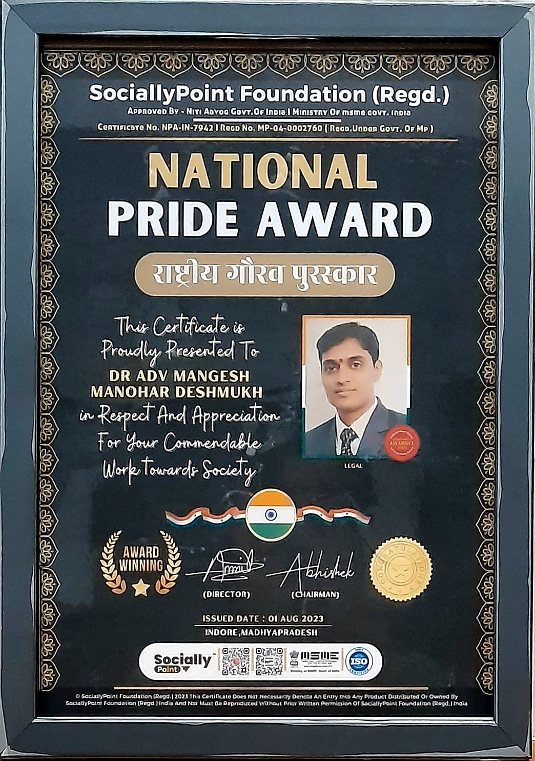 Justice is not just a concept—it’s a calling. With an unwavering commitment to fairness, equality, and public awareness, Mr. Mangesh Manohar Deshmukh stands as an inspiring figure in the field of law. His dedication to educating and empowering the youth about the legal system has made a remarkable difference in shaping future generations of advocates and responsible citizens. Recognizing that many young people lack awareness of their legal rights, new laws, and their societal importance, Mr. Deshmukh has taken proactive steps to bridge this knowledge gap. Through his extensive awareness programs conducted in colleges and schools, he has personally connected with thousands of students, educating them on the role of law in maintaining justice and social harmony. His firm belief is simple yet powerful — “An informed youth is the strongest pillar of a just society.”